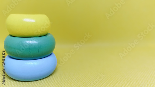 Blue, green, and yellow smooth, rounded shapes stacked on a yellow background.