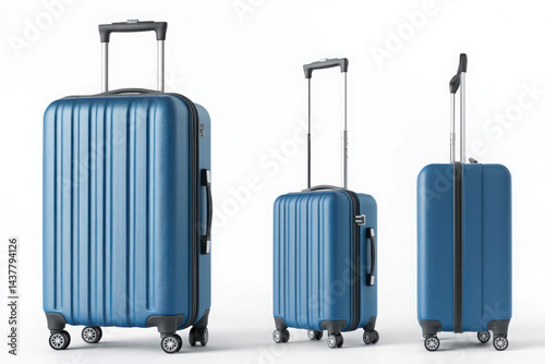 Blue hard-shell suitcases displayed from various angles on white background highlighting modern minimalist travel luggage design