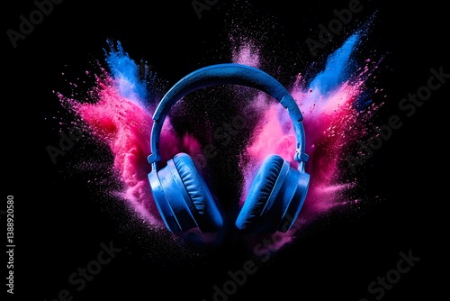 Blue headphones surrounded by pink and blue powder explosions on a black background.