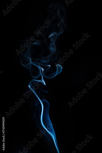 Blue hot curly steam smoke isolated on black background. Abstract background, design element, for overlay on pictures. Create mystical Halloween photos