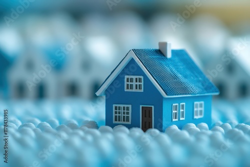 Blue house model sits amongst white foam balls. Illustrates real estate, homeownership, or new development concepts.