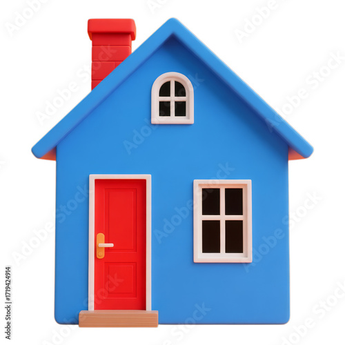 Blue House with Red Door and Chimney, 3D Realism Design Element with Transparent Background