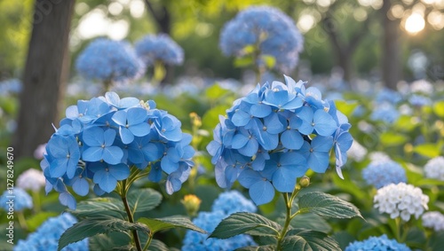 Blue Hydrangea Flowers in Full Bloom During Summer with Lush Green Background and Space for Custom Text or Messaging