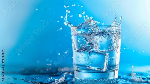 Blue ice cubes in a glass of water with a splash, vibrant background