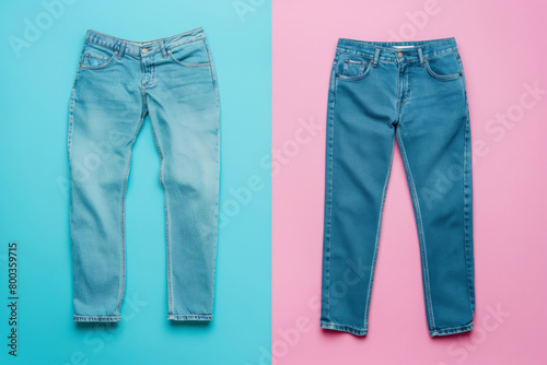Blue jeans on pink and blue split background for fashion and apparel mockups