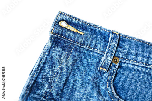 Blue jeans, texture. Isolated on white background. Pocket and metal botton. Closeup