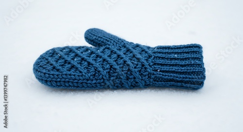 Blue Knitted Mitten Lying on Snowy Ground in Winter