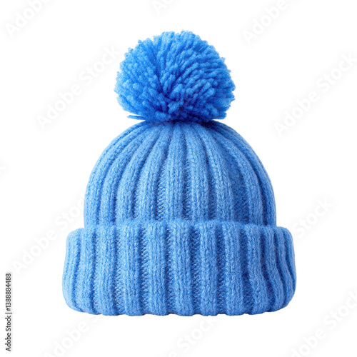 Blue knitted winter hat with pompom isolated on white background. Concept of winter fashion and accessories.