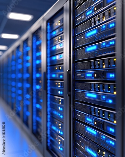 Blue LED Lights Illuminate Rows of Servers in Modern Data Center with Networking Equipment