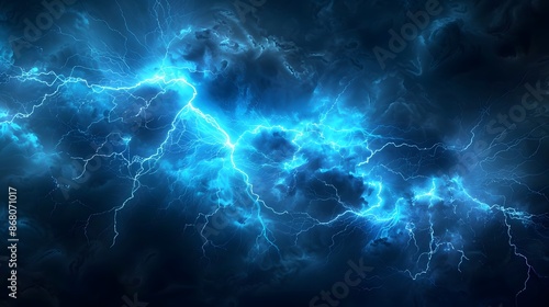 Blue lightning background, dark blue color, a lightning effect, electricity, energy flow, an electric field, glowing lightnings, an electric storm, thunderstorm, black sky.