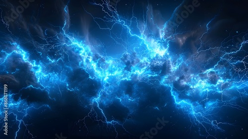 Blue lightning background, dark blue color, a lightning effect, electricity, energy flow, an electric field, glowing lightnings, an electric storm, thunderstorm, black sky.
