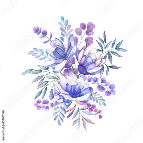 Blue, lilac exotic spring flowers bouquet Lotus flowers, eucalyptus branch. Watercolor tropical botanical illustration.