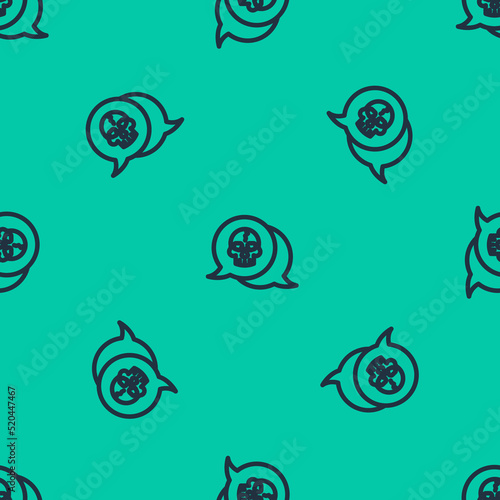 Blue line Skull icon isolated seamless pattern on green background. Pirate captain. Happy Halloween party. Vector