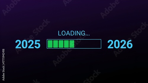 Blue loading bar from 2025 to 2026 on a dark blue and black background. New Year concept