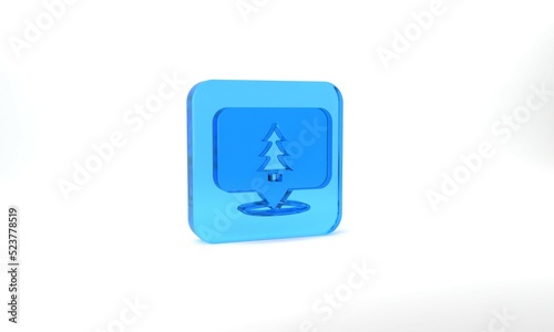 Blue Location of the forest on a map icon isolated on grey background. Glass square button. 3d illustration 3D render