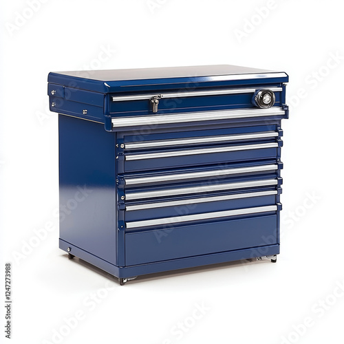 Blue metal tool chest with multiple drawers, chrome handles, locking mechanism, and wheels on a white background.