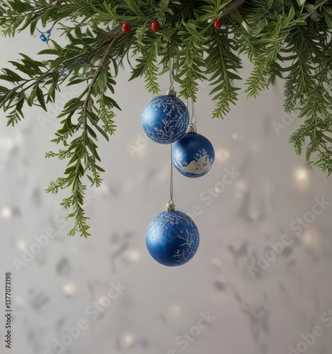 Blue mistletoe hanging from a branch with Christmas ornament elements, mistletoe, holly, holiday season