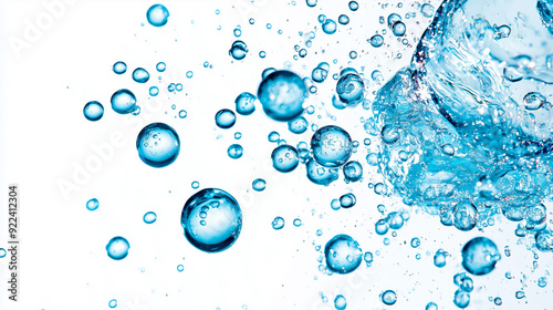 Blue Molecules and Water Bubbles on a White Background, Featuring Abstract and Scientific Elements in a Unique Artistic Style