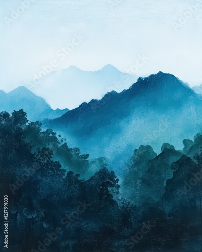 Blue mountains landscape trees art painting, wall art, design, realistic, textured painting