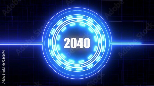 Blue Neon Futuristic Circle With Year 2040 Displayed In White Against A Dark Grid Background future new year