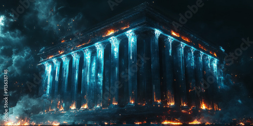 Blue neon glowing outline of a bank building on a dark abstract background, concept of finance and technology