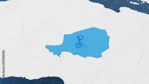Blue Niger 3d map with pointer pin surrounded with other countries in white.Political map with borders. 3d render illustration