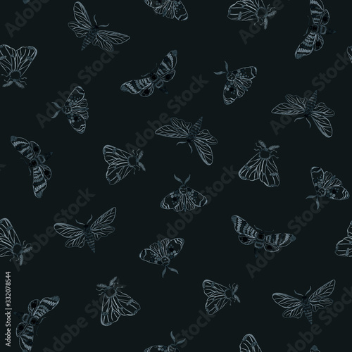 blue night moth, indigo butterfly seamless pattern, watercolor vintage illustration, hand drawing