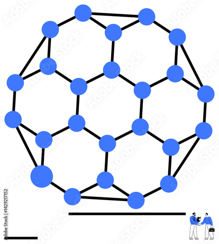 Blue nodes connected by black lines forming a molecular-thumbs up structure with scientists interacting below. Ideal for technology, research, education, teamwork, innovation, science communication