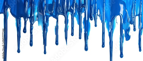 Blue paint drips down in a rhythmic dance, accentuating the purity of the white background
