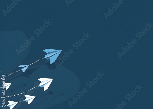 Blue Paper Plane Leading White Ones on Dark Blue Background