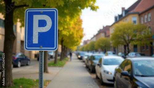 Blue parking sign on metal pole, cars parked nearby, cars, transport, zone