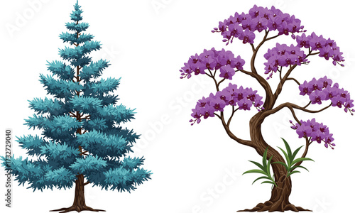 Blue pine tree with branches and purple orchid flowering tree illustration, tropical botanical design, vibrant seasonal nature artwork, decorative garden landscape