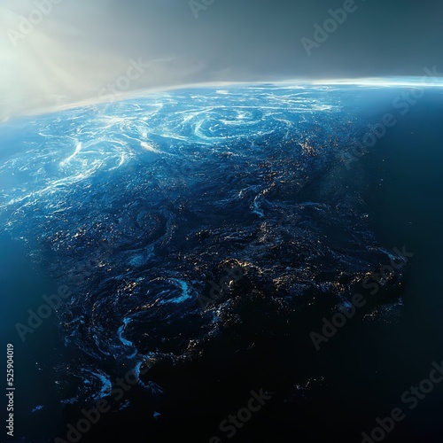 Blue planet with swirls on surface and sun glowing. 3d art.