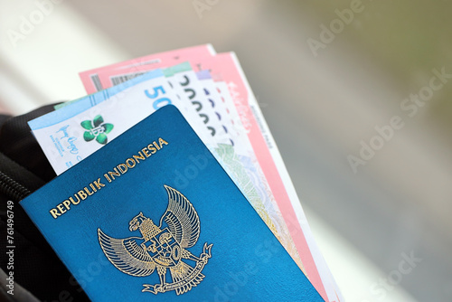 Blue Republic Indonesia passport with money and airline tickets on touristic backpack close up. Tourism and travel concept
