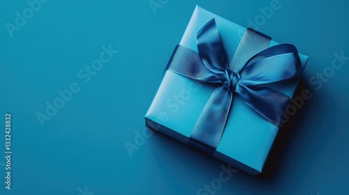 Blue ribbon gift box on blue backdrop for Father's Day or Birthday celebration. Festive decor with top view and space for Men's Day.