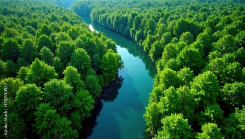 Blue river meanders through lush green delta forest Aerial view , wetland, vegetation, aerial