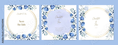 Blue rose elegant wedding invitation card template with watercolor floral and leaves. Wedding floral watercolor background with square post template and social media