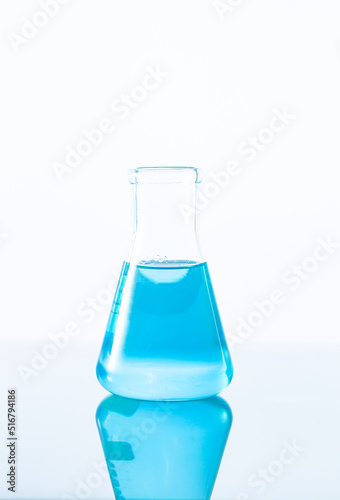 blue science experiment flask on white background