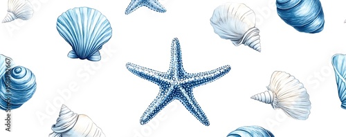 Blue seashells starfish pattern, summer ocean