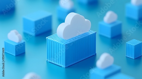 Blue shipping containers with cloud symbols representing cloud computing and data storage on a soft-focus turquoise background.