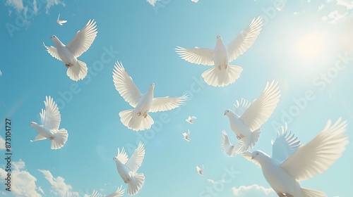 Blue sky backdrop with a cluster of white doves ascending on the left, minimalist design, ample space for text overlay, promotional banner, 3D rendering.