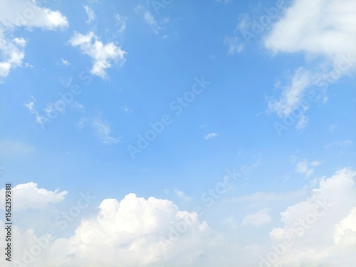Blue sky background with white clouds in summer. Soft white clouds float in the clear blue sky. Clear blue sky, bright spring, soft sky gradient, wallpaper landscape, aerial view.