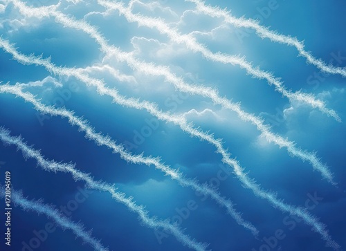 Blue sky filled with soft white lines resembling contrails or wispy clouds creating a serene and airy atmosphere