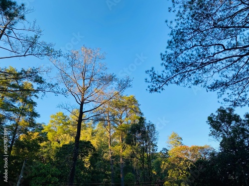 Blue Sky Pine Tree Background. Pine Forest Sky View Wallpaper. Scenic Tall Trees Nature Background. Forest Canopy and Clear Sky Wallpaper. Outdoor Pine Woodland Background. Beautiful Pine Landscape.