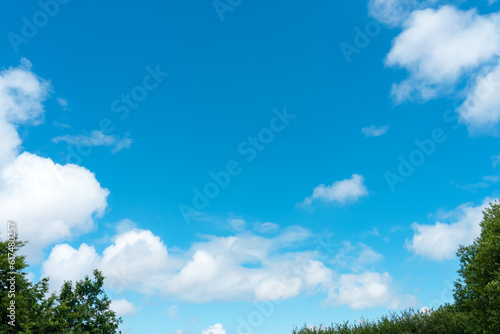 Blue Sky Summer with fluffy clouds over green rain forest tree. Horizon Beauty Summer landscape of forest with clear sky in environment public park,