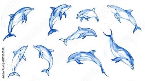 Blue, smoke-like dolphins jumping, swimming.
