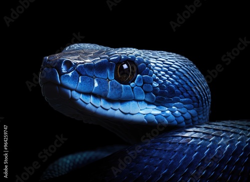 Blue Snake with Intense Eyes on Black Background