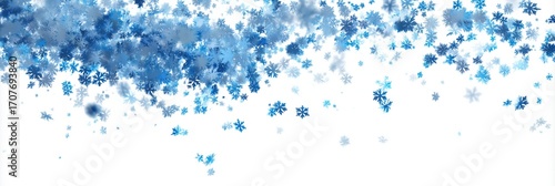 Blue snowflakes falling against white background in winter scene