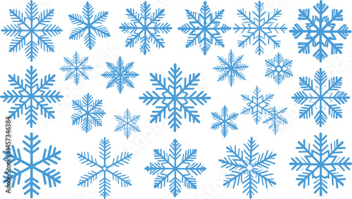 Blue snowflakes icons in various designs and patterns. Vector cartoon illustration set.