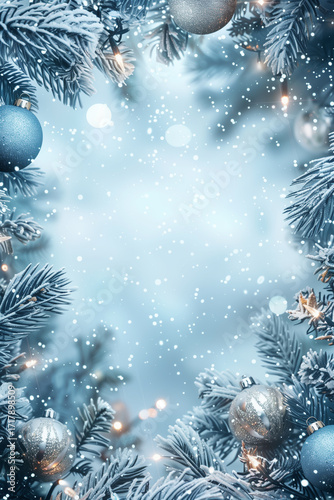 Blue Snowy Christmas Background with Pine Branches and Ornaments